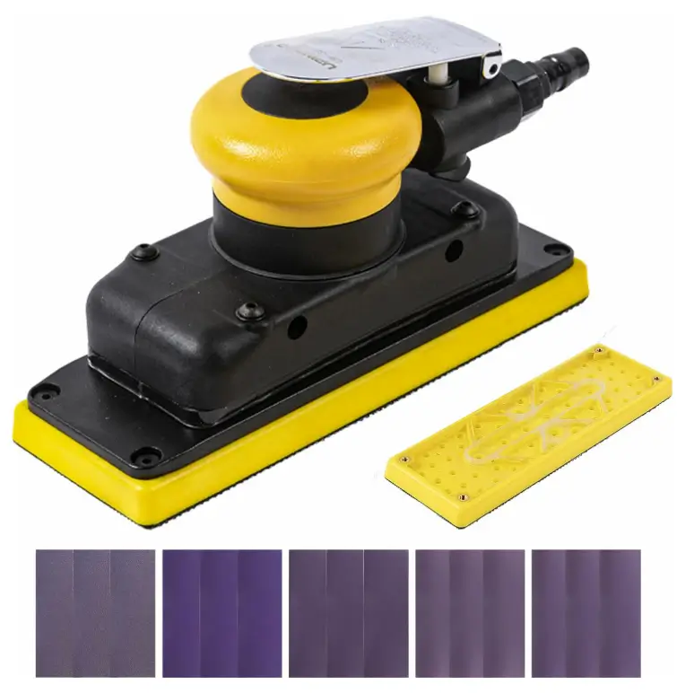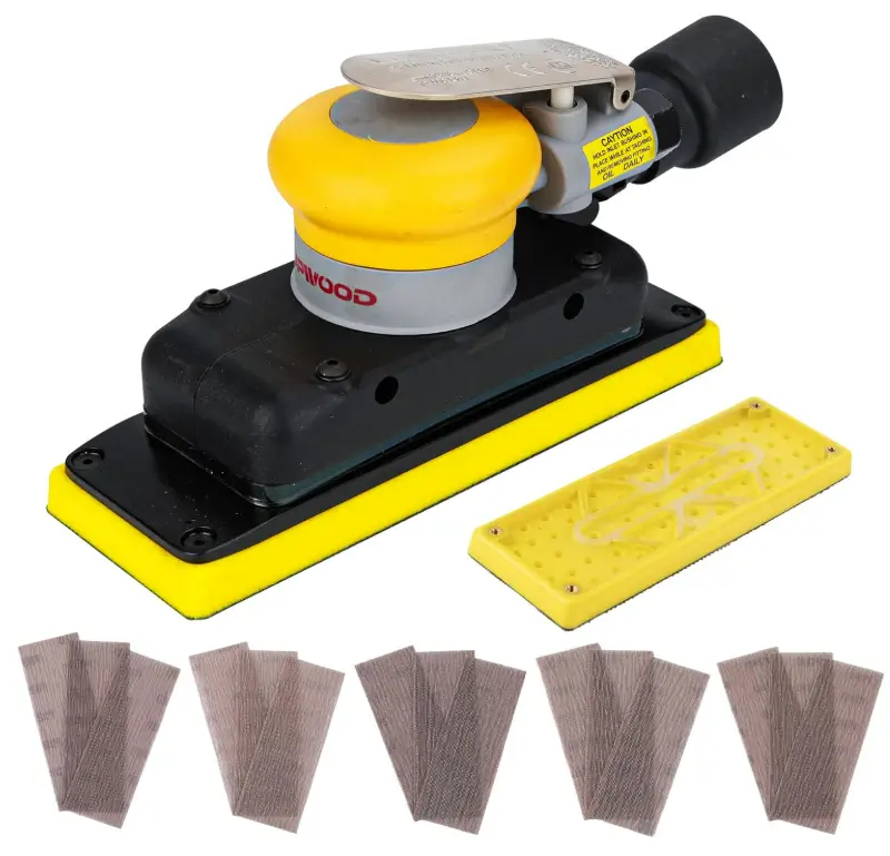 The 2-3/4″ x 8″ Dust-free Air Orbital Sander is designed for smooth, efficient sanding on wood, metal, automotive surfaces, furniture, and finishing projects. Its 1/8 inch orbit and 10,000 max OPM help deliver consistent sanding results while the dust bag style central vacuum helps keep the workspace cleaner. The long 70 mm x 198 mm sanding pad provides good surface coverage, making it useful for flat panels, edges, and detailed preparation work. With an extra hook-loop pad and 15 mesh sandpapers in 80, 120, 180, 320, and 400 grits, this sander gives buyers a practical ready-to-use kit for different sanding stages