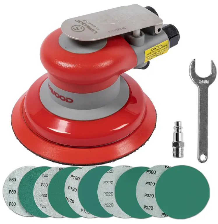 UPWOOD Pneumatic random orbital sander 5-inch light weight palm sander 3/16″ (5 mm) diameter orbit 12000 RPM with extra 10pcs sandpaper