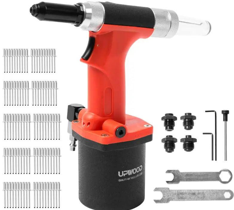 UPWOOD Heavy Duty Air Hydraulic Riveter Pneumatic Hydraulic Pop Rivet Gun, Hand Feed Air Riveter Riveting Tool with 100 pcs Blind Rivets and 3/32″ 1/8″ 5/32″ 3/16″ Nose Pieces